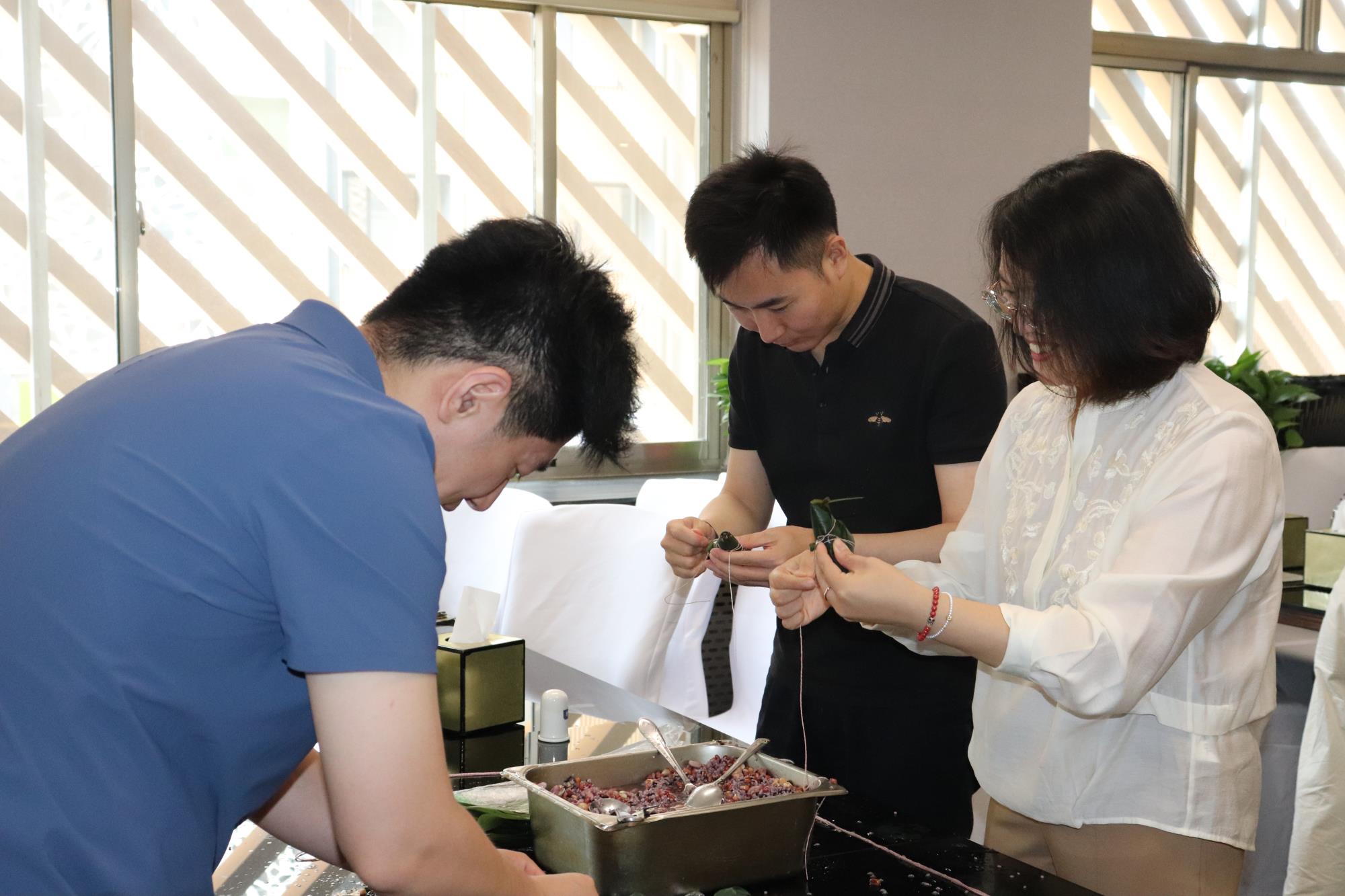 活動中,山東文旅酒店集團大廚耐心為大家傳授包粽子的技巧。從挑選粽葉、填糯米、放餡料,到包裹、捆扎,每一個步驟都細致演示。大家團聚在一起,一邊學習,一邊動手實踐。不一會兒,一個個棱角分明的粽子便整齊排列,大家互相交流、互相幫助,歡聲笑語不斷。