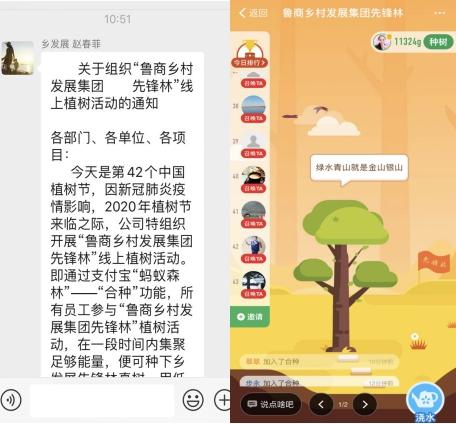 陽春三月,萬物復蘇。在第42個植樹節到來之際,魯商鄉村發展集團有限公司持續秉承習近平總書記“綠水青山就是金山銀山”的綠色發展理念,針對疫情當前無法線下植樹的實際,于3月12日上午發起了“春暖綠漸濃 春種正當時”線上公益植樹活動。