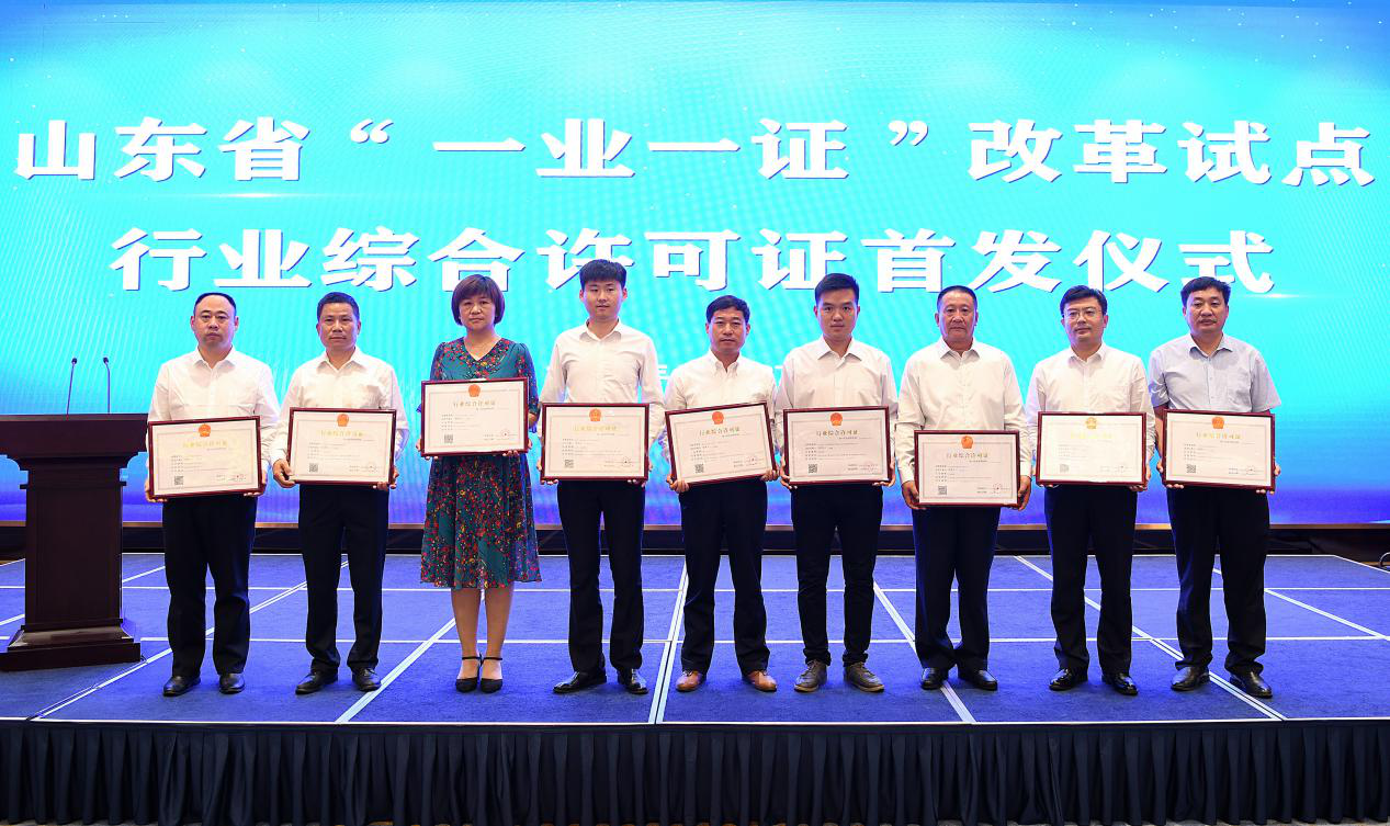 5月27日,山東省“一業(yè)一證”改革試點(diǎn)行業(yè)綜合許可證首證頒發(fā)儀式在濟(jì)南舉行。山東省副省長(zhǎng)任愛(ài)榮向20個(gè)行業(yè)頒發(fā)了行業(yè)綜合許可證,魯商九女峰(泰安)鄉(xiāng)村振興有限公司總經(jīng)理于在武第一個(gè)上臺(tái)領(lǐng)取許可證。山東首次頒發(fā)行政綜合許可證標(biāo)志著我省“一業(yè)一證”改革邁出了重要的一步,將最大限度減材料、簡(jiǎn)環(huán)節(jié)、壓時(shí)限,讓企業(yè)群眾少跑腿、不跑腿,是我省深化商事制度改革,破解“準(zhǔn)入不準(zhǔn)營(yíng)”難題,實(shí)現(xiàn)“一窗受理·一次辦好”的重大改革舉措。山東省委常委劉強(qiáng)出席儀式并致辭。