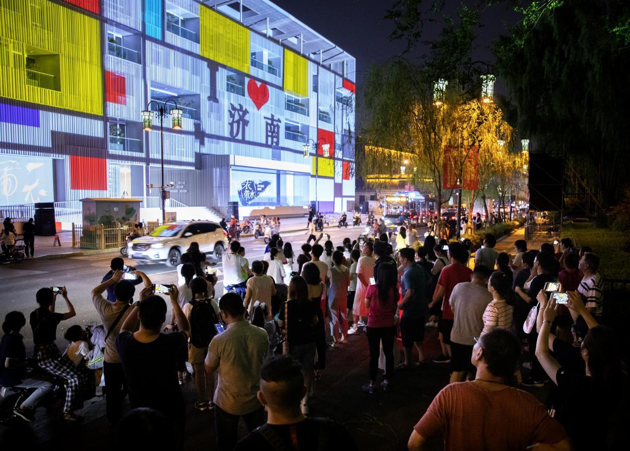 活動中,一場致敬中國傳統文化精神、鏈接國際當代藝術風尚潮流的“Light it up·點亮濟南光影展”在每晚19點30分至22點準時扮靚大明湖,絢麗的光影刷爆了泉城市民的朋友圈。這場“藝術”與“科技”融合的沉浸式視覺盛宴點亮了城市夜經濟,刷新了泉城市民的感官體驗。