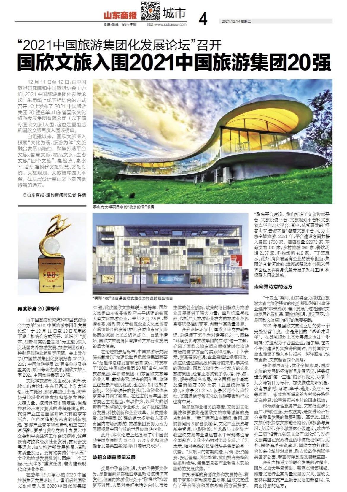 12月11日至12日,中國旅游研究院、中國旅游協會主辦的“2021中國旅游集團化發展論壇”以線上線下相結合的形式舉辦,發布了《中國旅游集團化發展報告2021》、2021中國旅游集團20強及提名名單,以及典型案例、項目等研究成果。山東省國欣文化旅游發展集團有限公司(簡稱“國欣文旅”)成功入選“2021中國旅游集團20強”,這是國欣文旅2020年8月成立以來第二次入選。文化和旅游部黨組成員、副部長杜江出席論壇并講話。國欣文旅黨委副書記、總經理丁藝通過線上方式參會并在“圓桌對話”環節交流發言。
