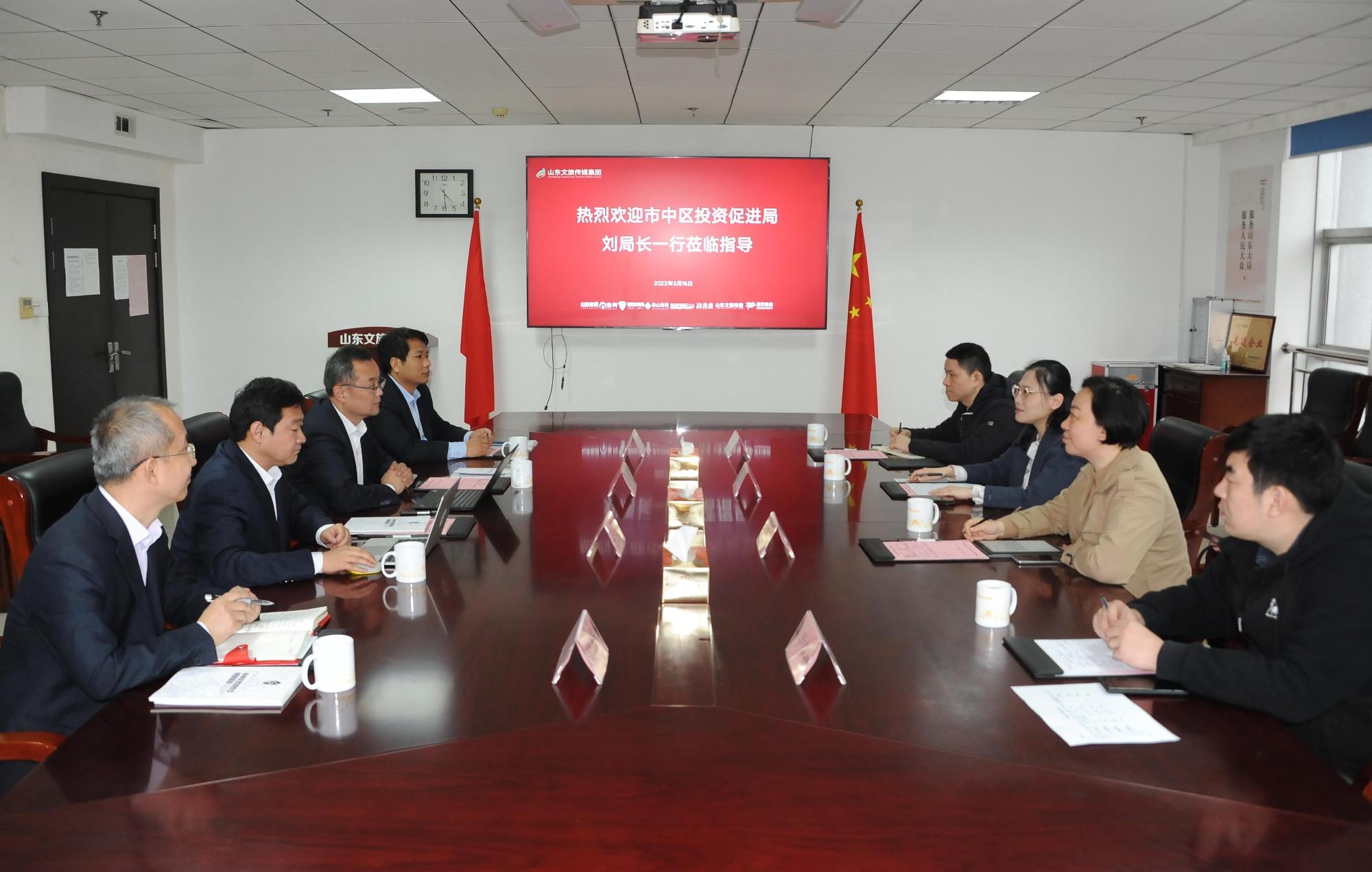 3月16日,濟南市市中區投資促進局局長劉妙一行到山東文旅傳媒集團座談交流。山東文旅傳媒集團黨委書記、董事長,山東省文旅產業創新研究院院長龐道鋒熱情接待。山東文旅傳媒集團黨委委員、總經理王法爭,黨委委員、副總經理張長杰參加活動。
