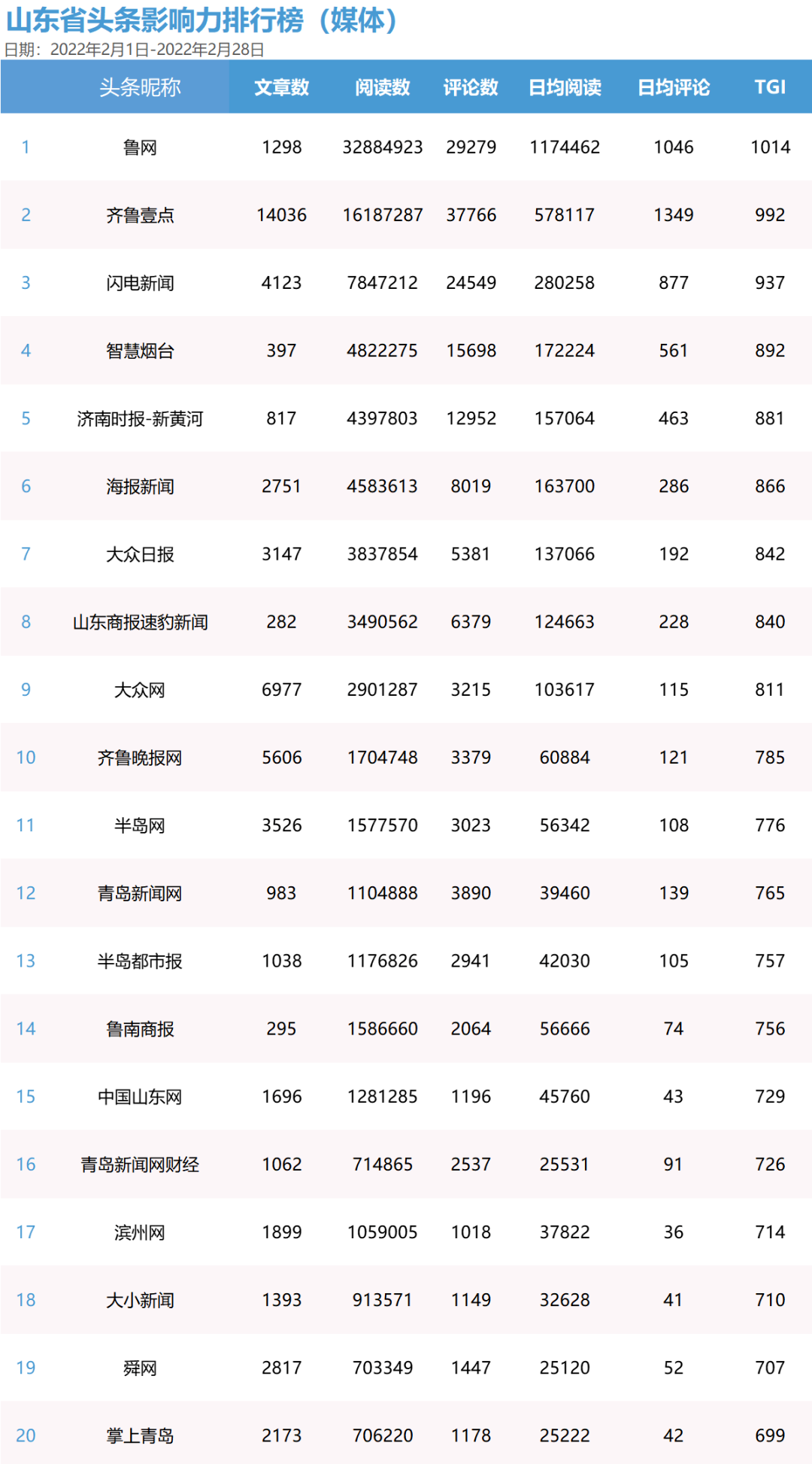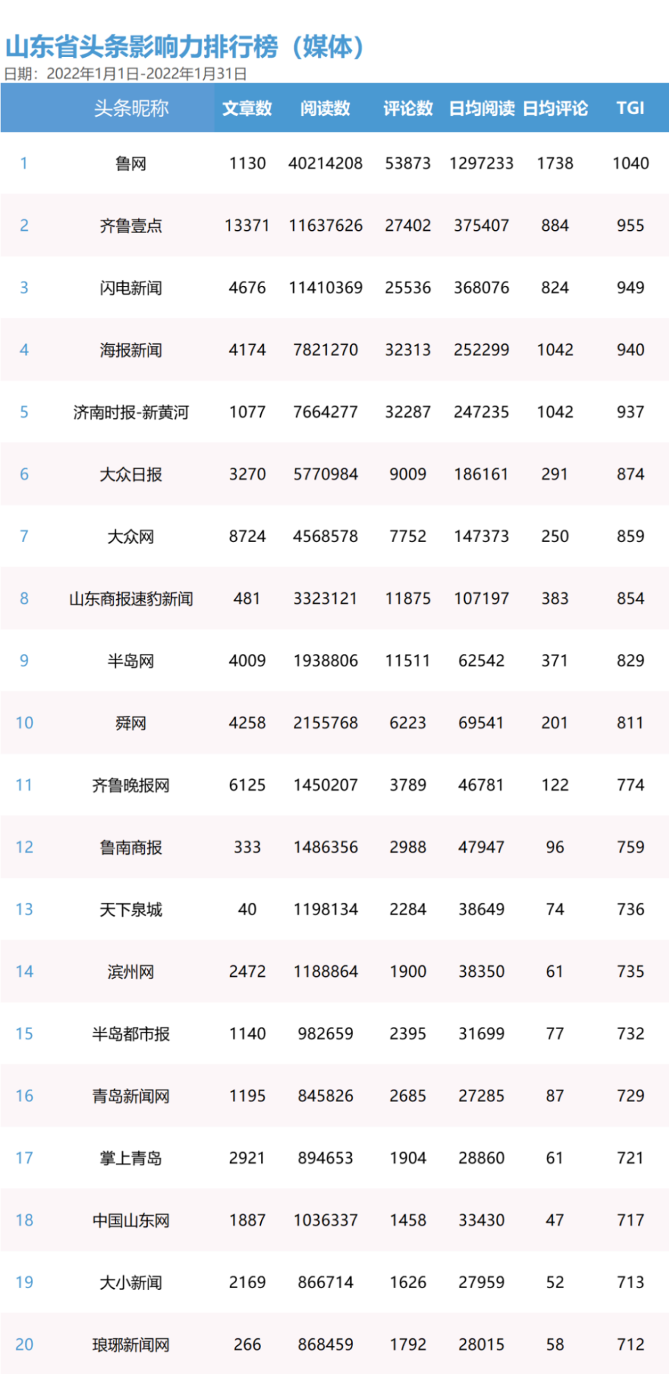在此前發(fā)布的1月份山東省頭條影響力排行榜(媒體)中,“魯網(wǎng)”均篇傳播效果最佳,篇均閱讀量突破3萬,共獲得4021萬閱讀量、129萬日均閱讀量和5萬評(píng)論數(shù),超過榜單中其他媒體賬號(hào),以1040的TGI值位列第一。