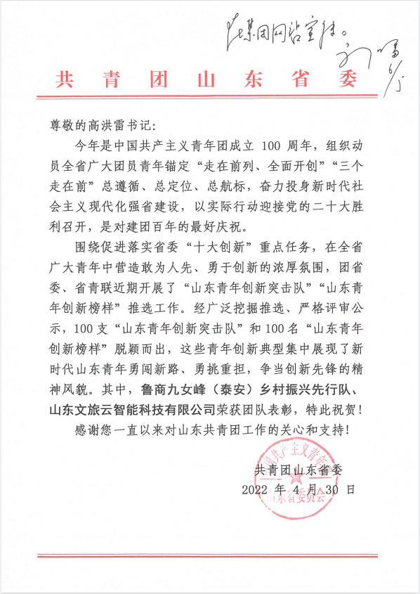 近日,山東文旅集團(tuán)黨委書(shū)記、董事長(zhǎng)高洪雷收到團(tuán)省委發(fā)來(lái)的賀信,祝賀集團(tuán)直屬單位山鄉(xiāng)集團(tuán)九女峰(泰安)鄉(xiāng)村振興先行隊(duì)、山東文旅景區(qū)集團(tuán)山東文旅云智能科技有限公司在團(tuán)省委、省青聯(lián)開(kāi)展的“山東青年創(chuàng)新突擊隊(duì)”推選工作中,經(jīng)過(guò)嚴(yán)格評(píng)審脫穎而出,獲“山東青年創(chuàng)新突擊隊(duì)”榮譽(yù)稱號(hào)。